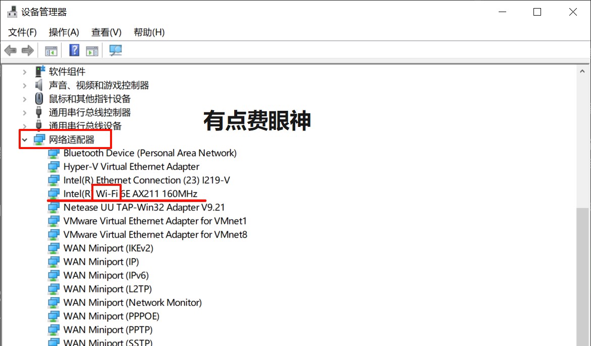 在 "设备管理器" 找到我们需要排查问题的 "网络适配器",点击下拉菜单,找到无线网卡(一般名字里会有"Wireless"或"Wi-Fi")