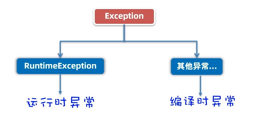 ArithmeticException // 算术异常(如除以零)- 编译时异常(CheckedException):编译器要求必须处理或声明抛出,也称为受检异常
